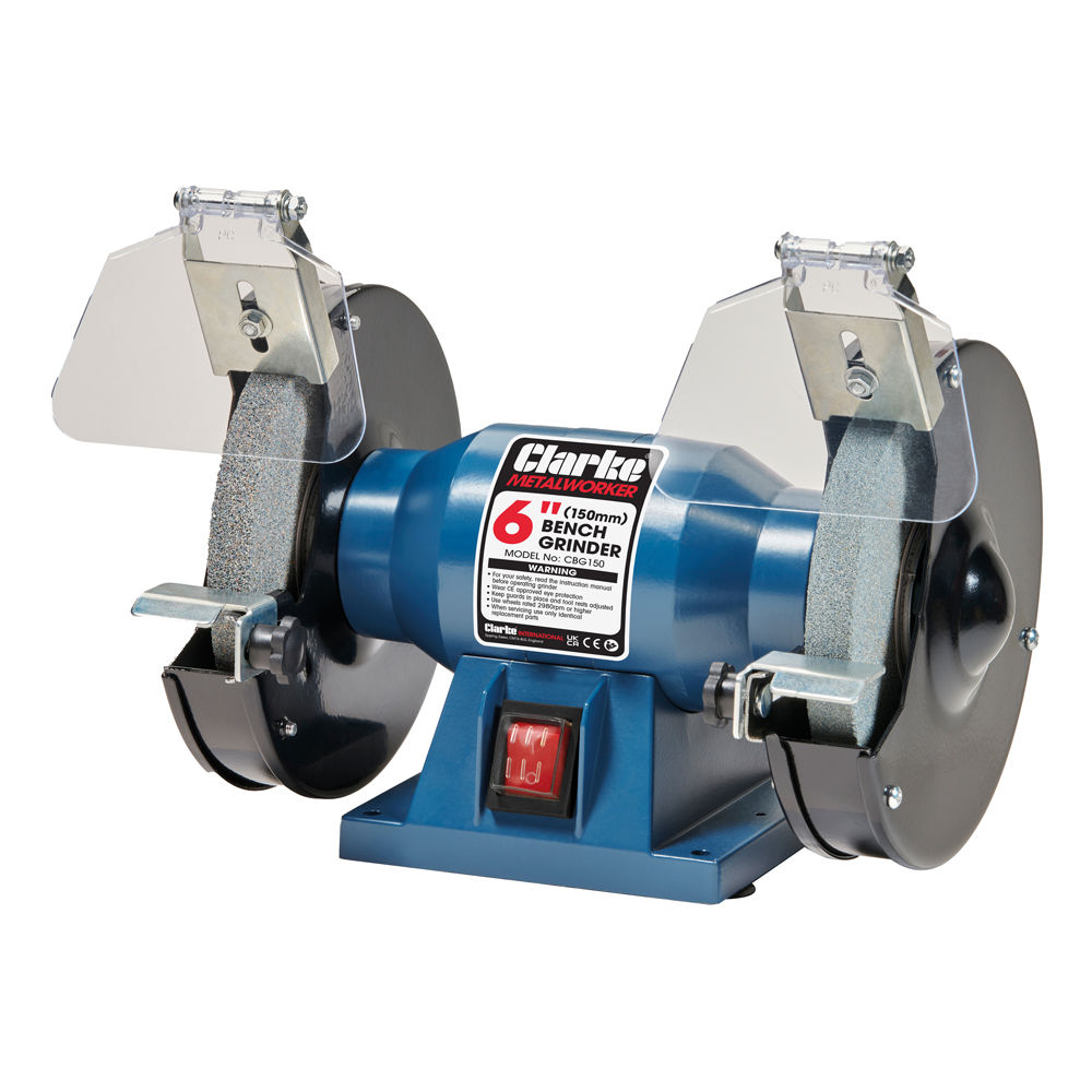 This bench grinder is a powerful and efficient tool that is useful for sharpening tasks including knives, scissors, chisels and shaping/de-burring metal work pieces. Its 150W 230V motor is compact, yet versatile, delivering 2980rpm to both grinding wheels. The product delivers optimum grinding performance for a variety of tasks via two wheels (36 Coarse & 60 Medium). Complete with adjustable eye protection/spark arrestors, the user is fully protected from flying particles, and is equipped with removable wheel guards for easy wheel changes.